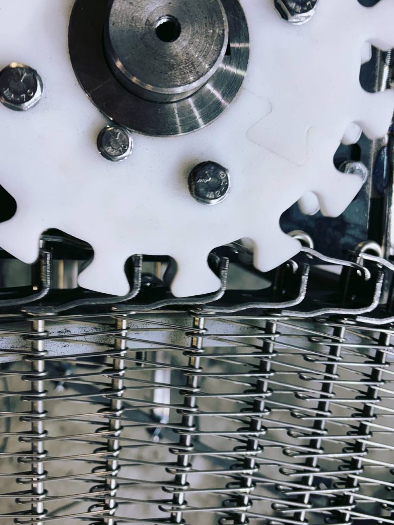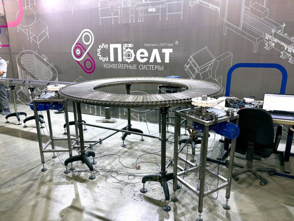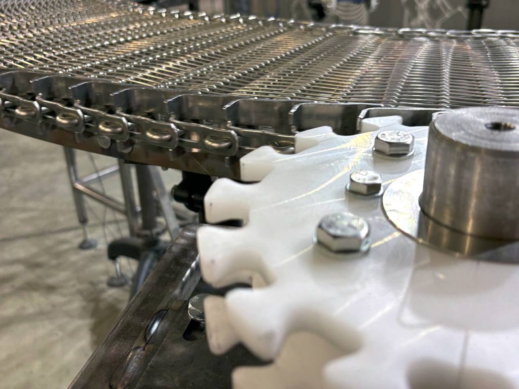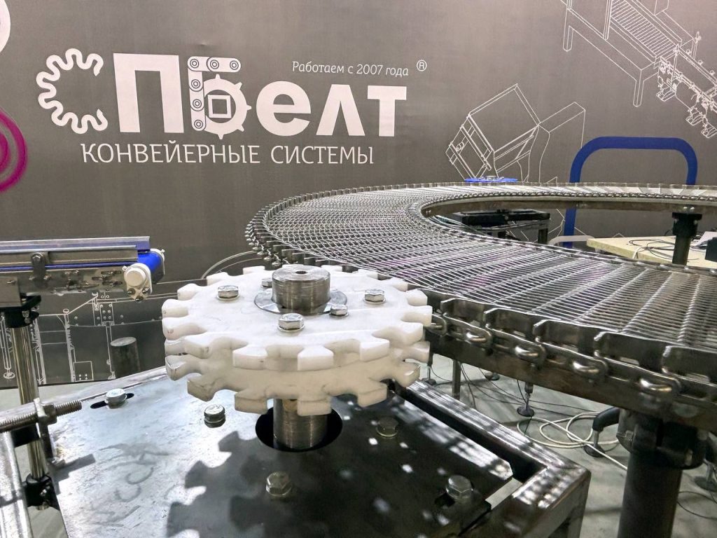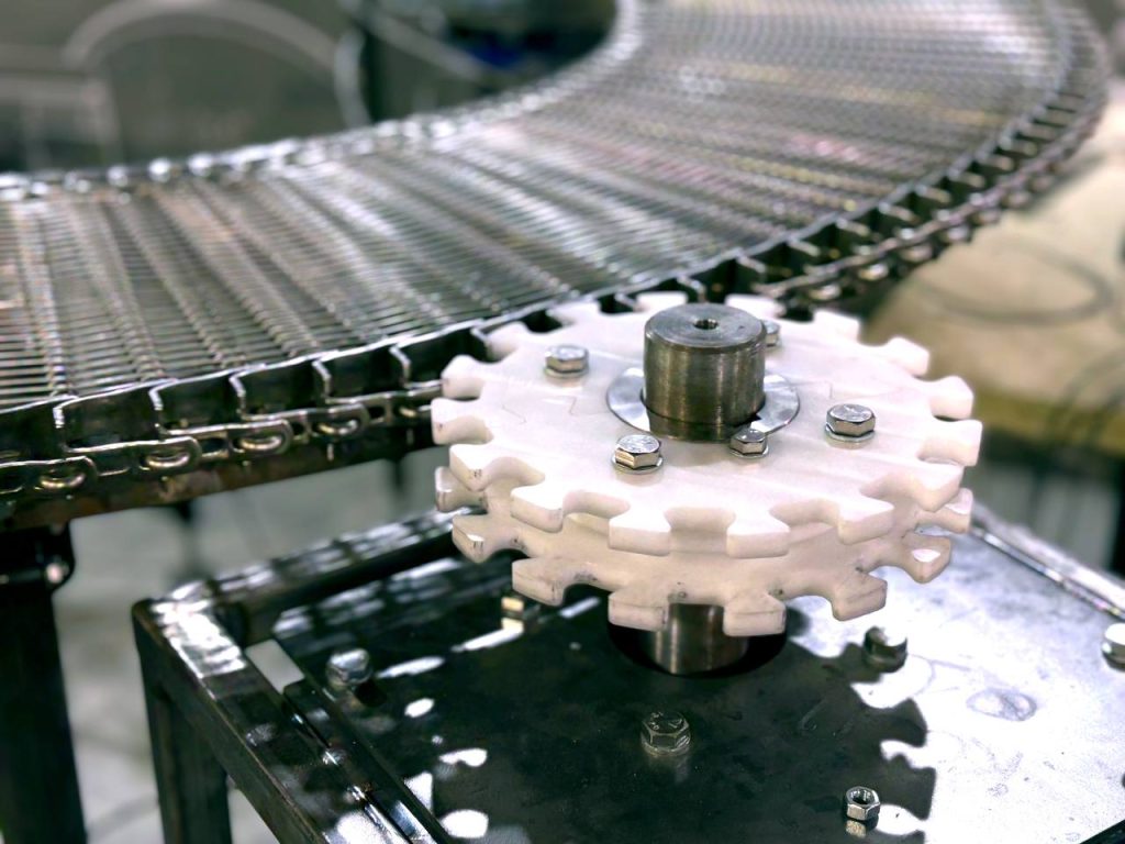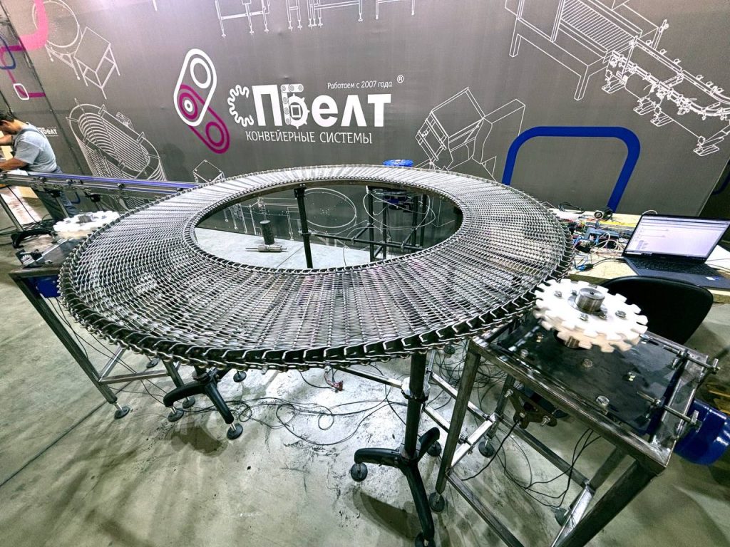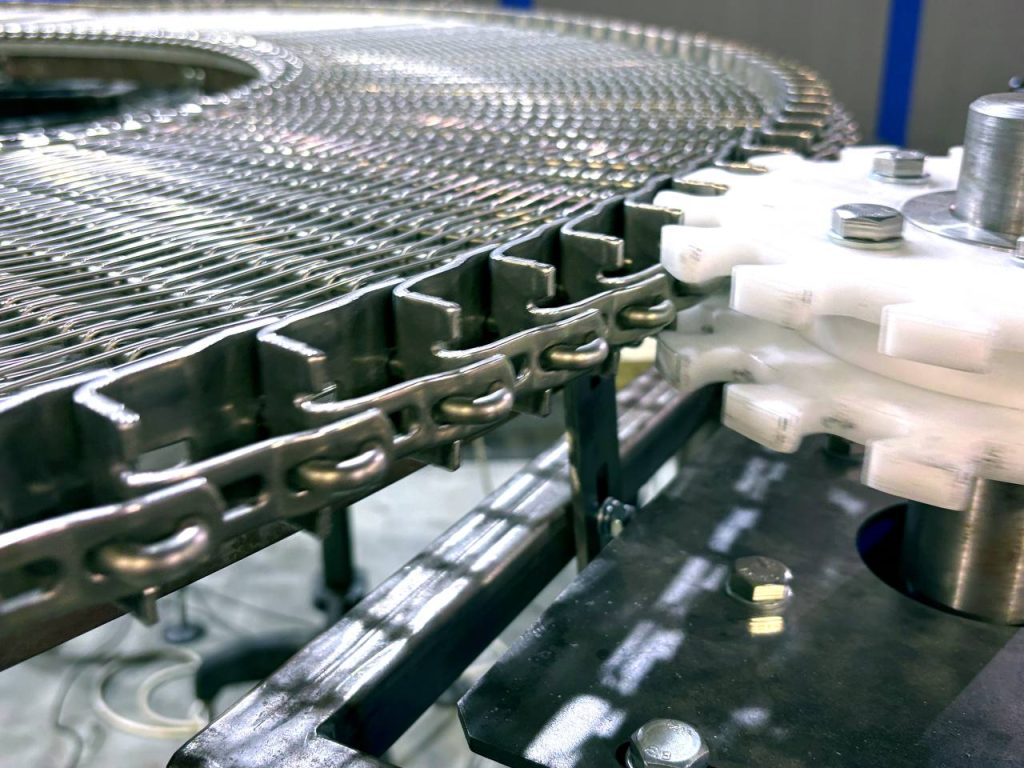 Мы разрабатывали металлическую сетку и механизм боковых приводов специально для спирального конвейера. Для проверки собрали круговой участок будущей линии и подключили три мотор-редуктора. Синхронизация приводов оказалась непростой задачей: скорость и натяжение должны совпадать, иначе сетка рискует повредиться.