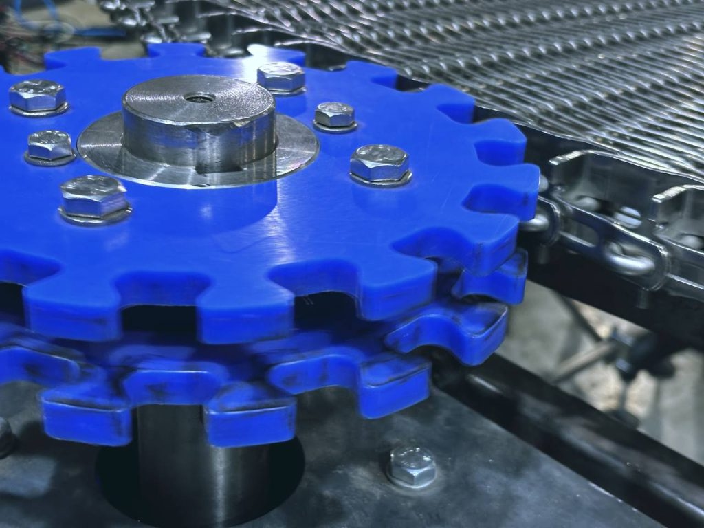 • звёздочки для зацепления цепи изготовлены из прочного полимера на наших мощностях — это снижает шум и износ сетки;