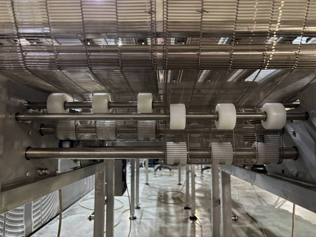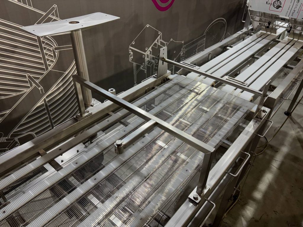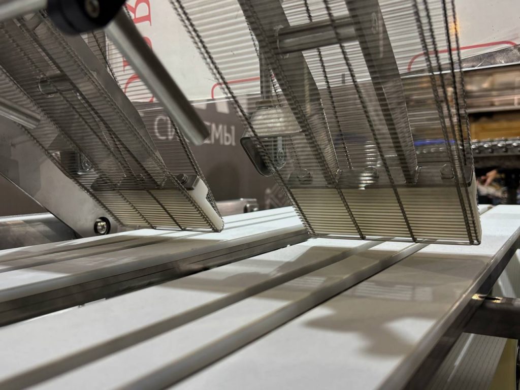 • четыре сетчатых конвейера на одной раме выравнивают ряды блинов;