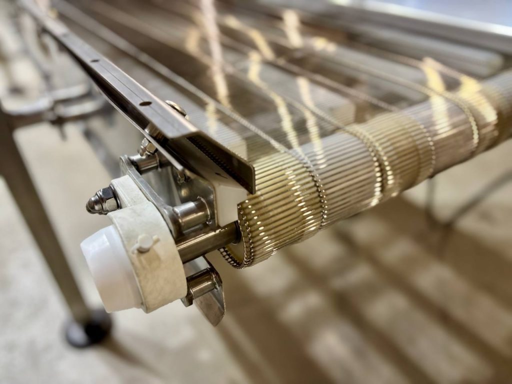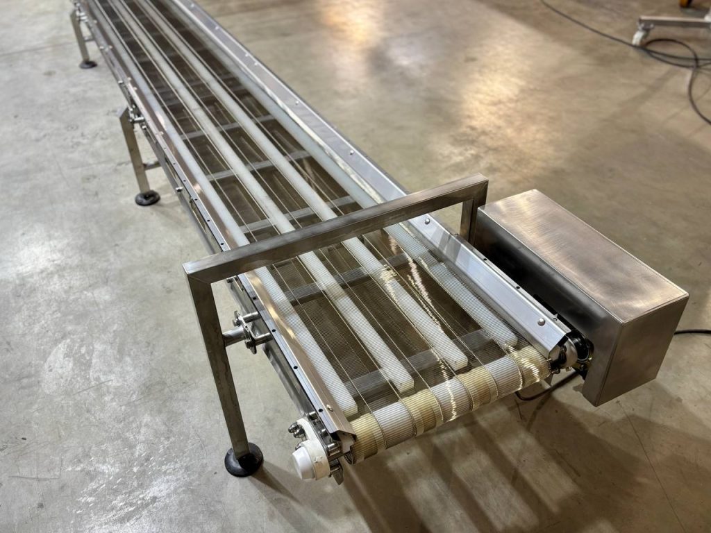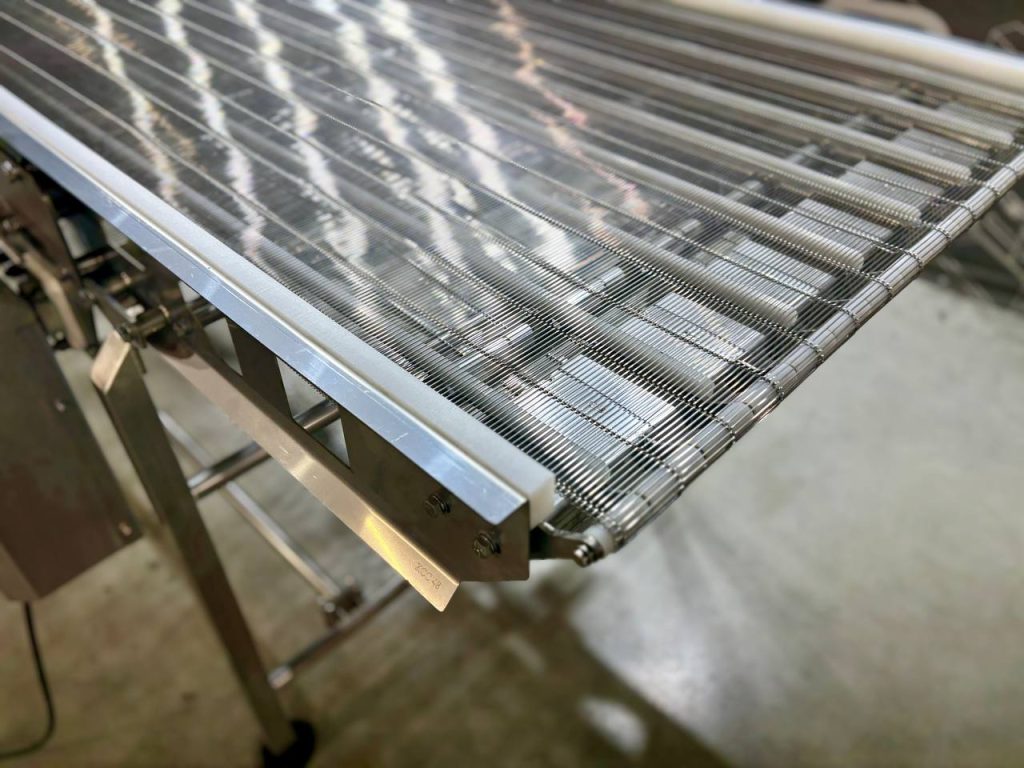 Для одного из предприятий мы разработали и изготовили два конвейера на основе нержавеющей глазировочной сетки. Оборудование предназначено для транспортировки мясных полосок и кусочков влажного корма с температурой продукта до 90 °C.