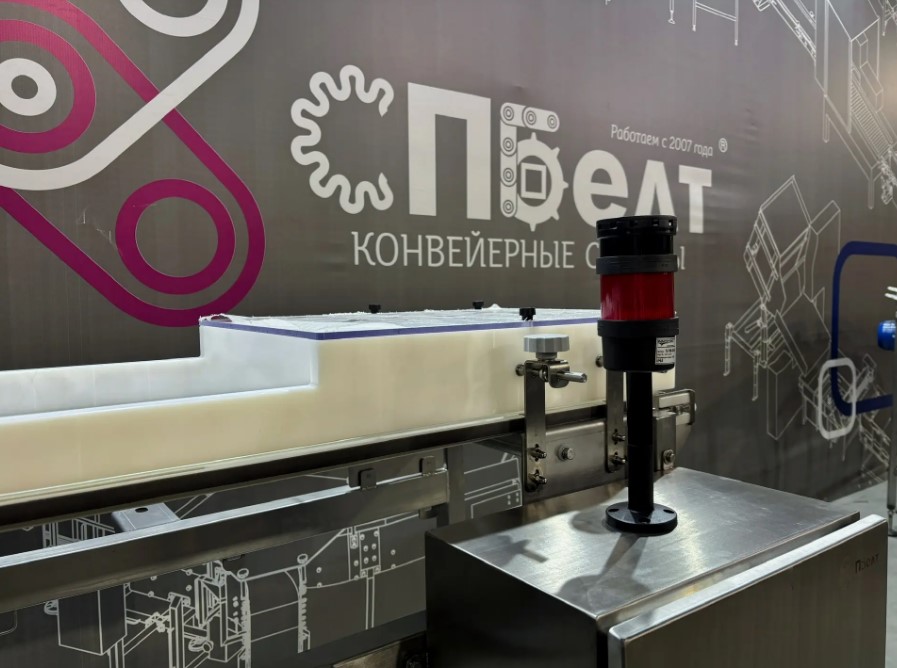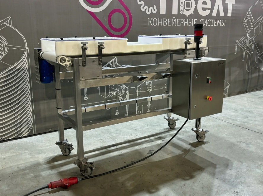 Проект реализован под габариты и вес продукции, а также особенности участка контроля. Конвейер поставлен в сборе, готов к установке на производстве.