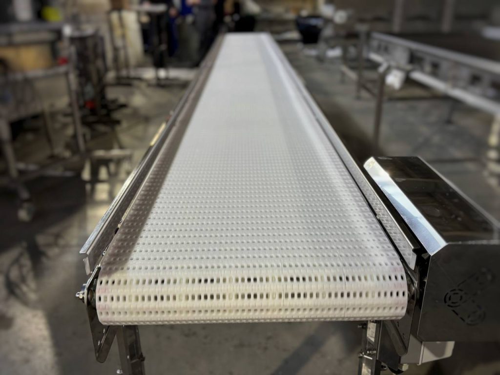 Конвейер длиной 5 м и шириной ленты 500 мм выполнен из нержавеющей стали AISI 430 и 201 с элементами из полиэтилена PE и крепежом A2. В качестве рабочей поверхности использована модульная лента ML2541 (POM/PBT) — износостойкая, устойчивая к влаге и легко очищаемая.